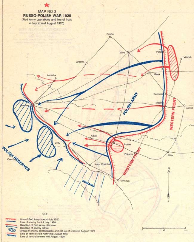 1. To appreciate what our position was on the Polish front in mid-August it is necessary to note briefly the main phases of our offensive towards Warsaw. After July 5, following a swift blow which broke through the enemy’s positions, the 4th, 15th and 3rd Armies moved into a decisive offensive all along the front. Comrade Gay’s cavalry corps, advancing deeply into the enemy’s rear, cut the Warsaw railway (at Turmont station) and increased still further the disorder in the Polish armies. On July 7 the 16th Army forced a crossing of the Berezina and on 11th July took Minsk. As a result of these defeats, the Poles withdrew to the line they had originally designated for defence, along the rivers Narew and Western Bug. Bitter fighting began along the line of these rivers. On August 3 our forces took Lomza: two days earlier, after five attacks, they had captured Brest-Litovsk, which meant that Warsaw was put in immediate danger. (See Map No.3).
