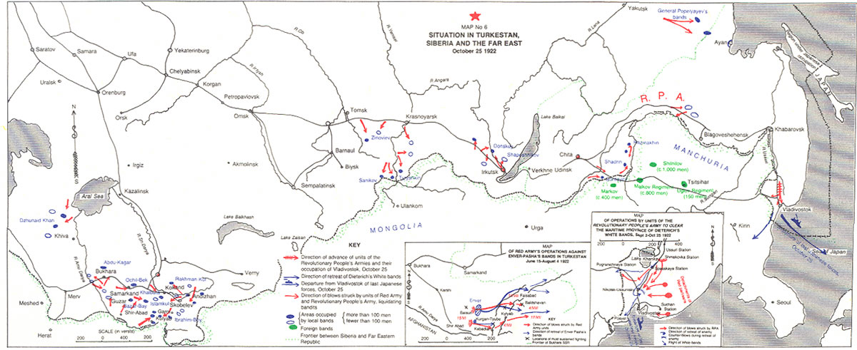 1. On the general situation in the Maritime region, see above, note 38. The Kappelites’ offensive was organised with all-round support from Japan, which set up a ‘Maritime buffer state’ in the form of Merkulov’s government. At the end of November 1921 the Kappelite bands, supported by Japanese armoured cars and artillery, attacked along the Ussuri Railway and, pushing back the scanty units of the People’s Revolutionary army of the FER, occupied Khabarovsk on December 22. Throughout January 1922 a stubborn struggle was waged for the fortified positions on the river In. After capturing these, units of the People’s Revolutionary Army went over to the offensive, and on February 14, Khabarovsk was again in the hands of Red units. The subsequent course of events, up to the occupation of Vladivostok, can be followed from note 38 (See Map No.6).