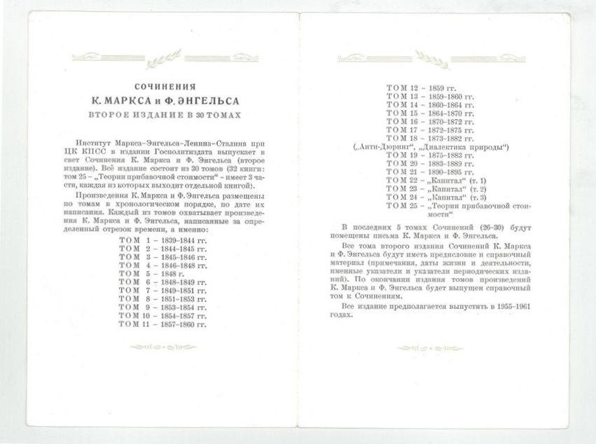 苏联共产党中央委员会下属的马克思恩格斯列宁斯大林研究院编译的《马克思恩格斯全集》将由国家政治书籍出版局出版。全集包括30卷(共32册,第25卷《剩余价值理论史》分为三个部分,每个部分单独成册。)