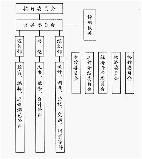 全国铁路总工会及各路总工会,应注意使全体执行委员会在某一定期间内能够召集会议,所以委员人数不能太多。全体委员会中应互选常务委员若干人执行经常会务,常务委员会中应推举书记一人为常务委员会主席,管部委员二人,分任组织部及宣传部事务,常务委员会书记下面可分设文书、会计、庶务收发……等科。组织部下面可分设调查、统计、登记交通、纠察……等科。宣传部下面可分设编辑、通讯、发行、教育、游艺……等科,办理各该项事务。此外常务委员会应斟酌情形设立各特种机关,如财政委员会,经济斗争委员会、救济委员会、工作介绍委员会、协作委员会等。此等委员会,各设主任一人,由各常务委员兼任之,委员若干人或就执行委员中选任,或聘请执行委员会以外有学识经验之人员担任,由常务委员会斟酌情形决定之。