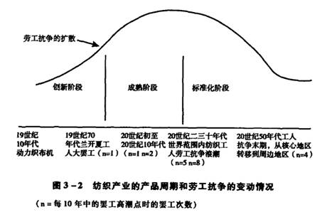 无论是在纺织产业还是在汽车产业的产品周期中,劳工抗争的首次重大成功都发生在第一个生产该产品的国家(例如,纺织产业的兴起是在英国,而汽车产业是在美国)。美国汽车工人构成了20世纪中期劳工抗争的先锋,他们在全国范围内奠定了工作和报酬的基本标准;与之相类似,在19世纪晚期的英国,纺织工人工会是最强大的工会之一。
