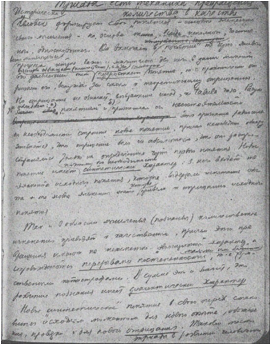 [35] 译注:在文前托洛茨基将量变转化为质变放在和扬弃实际上同等的位置,这是托洛茨基创新的地方,;而另外一边是列宁和普列汉诺夫哲学给他带来的影响,这两种对辩证法的理解可以说在托洛茨基的思想中并行不悖。但是如果今天写一篇论文对二者如此处理,就会被认为是素养极差,你的哲学生涯就此结束,因为你完全进入不了二者的语境之中。益于手稿特色的格式,让这种实验性哲学得以可能。