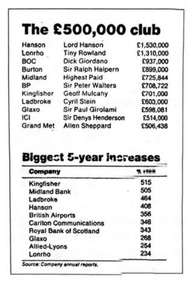 五十二年前奥威尔举英国人中每年收入最高的是5万镑(见1月27日日记引文),现在是153万镑。这样巨大的增加,一方面固然反映出英镑所值的差异,另一方面也暴露了在Thatcher政府下富者愈富的真相。据《卫报》记者的演算法这些大经理们二周所得,等于一位普通职员全年的收入。如果与普通工人的工资相比,差距当更加大了。为此「人民资本主义」能够万寿无疆吗?又:这群高级经理们的薪水每年增加33%,而工人的工资增加却只许7%或8%!