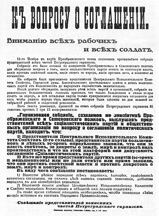 „Das Zentralexekutivkomitee ist der Meinung, daß in die Regierung Vertreter aller sozialistischen Parteien eintreten müssen, die in den Sowjets der Arbeiter-, Soldaten- und Bauerndeputierten vertreten sind und die Errungenschaften der Revolution vom 7. November anerkennen, das heißt die Sowjetmacht, die Land- und Friedensdekrete, die Dekrete über die Industriekontrolle durch die Arbeiter und die Bewaffnung der Arbeiter. Das Zentralexekutivkomitee beschließt daher, allen an den Sowjets beteiligten Parteien Verhandlungen über die Konstituierung der Regierung vorzuschlagen, und besteht auf folgenden Bedingungen als Grundlage:
