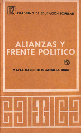 Alianzas y frente político Autor: Marta Harnecker & Gabriela Uribe Fecha: abril 1973 Colección: Cuadernos de Educación Popular. Número 12. Segunda serie: para luchar por el socialismo. Editorial: Departamento de Ediciones Especiales, División Editorial, Empresa Editora Nacional Quimantú Ltda., Chile |