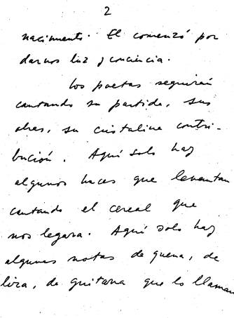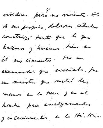 Los poetas seguirán cantando su parti­da, sus obras, su cristalina contribución. Aquí sólo hay algunas hoces que levan­tan cantando el cereal que nos legara. Aquí silo hay algunas notas de quena, de lira, de guitarra, que lo llaman aún. El desde su ausencia acude, acude siempre. Porque está vivo. Resplandece detrás de las antiguas piedras peruanas, camina por vías y carreteras, sube por los andamios, continúa su pensamiento. En el juego de la vida y la muerte Mariátegui sacó —no por azar— la cara o la cruz de la vida. Otros, vociferantes, inauditos, son vivi­dores pero no vivientes. El, de sus propias, dolorosas células construyó tanto que lo que hacemos y haremos tiene en él sus cimientos. Fue un examinador que ense­ñaba, fue un maestro que metió las ma­nos en la tarea y en el hombre para amal­gamarlos y encaminarlos en la Historia. Por eso los poetas elevaron el, canto hasta su altura. Hasta su silenciosa pre­sencia, hasta su prestigiosa ausencia, has­ta su dimensión creciente.