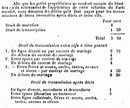 Le Parti ouvrier, qui veut établir la vraie égalité, demande que l'on supprime les charges qui pèsent sur les petits cultivateurs, en commençant par les droits de mutation entre vifs et de succession pour les propriétés d'une valeur inférieure à 5.000 francs.