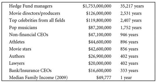 For me, the right-hand column says it all. What notion of economics, fairness or ethics justifies the fact that it would take the average family more than 35,000 years to earn as much as the average hedge fund elite earns in one year? And hedge fund honchos can’t sing, dance, write, direct, or play baseball. Yet, whatever they do dwarfs what such stars make. They also don’t make iPads or social media or cars. Yet they make many times more than CEOs of non-financial corporations. What could those hedge fund moguls possibly do to earn such riches?