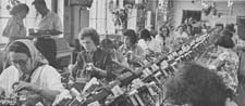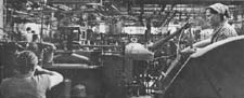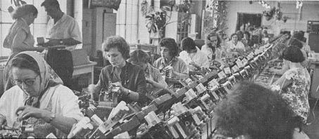 Building radios on an assembly line. Workers on a seven hour shift are surrounded by ample sunlight and plants hanging from the ceiling.(circa 1950s)