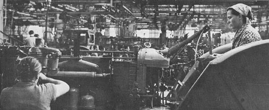 Women working a seven hour shift on the assembly line, build tractors in a highly automated factory. Over 60,000 tractors are produced by this small plant every year. (circa 1950s)