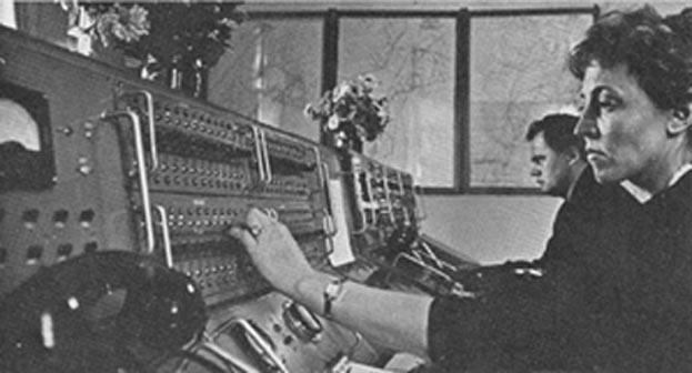A technician keeps careful watch over 200 electric oil wells, while potted flowers sit above both workers. Men and Women oftentimes worked side by side in the Soviet Union, where 75% of women were working full time jobs by the 1950s. (circa 1950s)