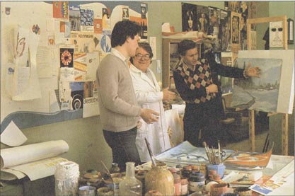 On their break, three employees talk about a painting. Behind them is a board of notices announcing shows and classes employees can attend. (circa 1980s)