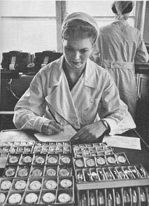 Larissa Kuzina examines watches before they are shipped out in Watch Factory #2. (circa 1950s)