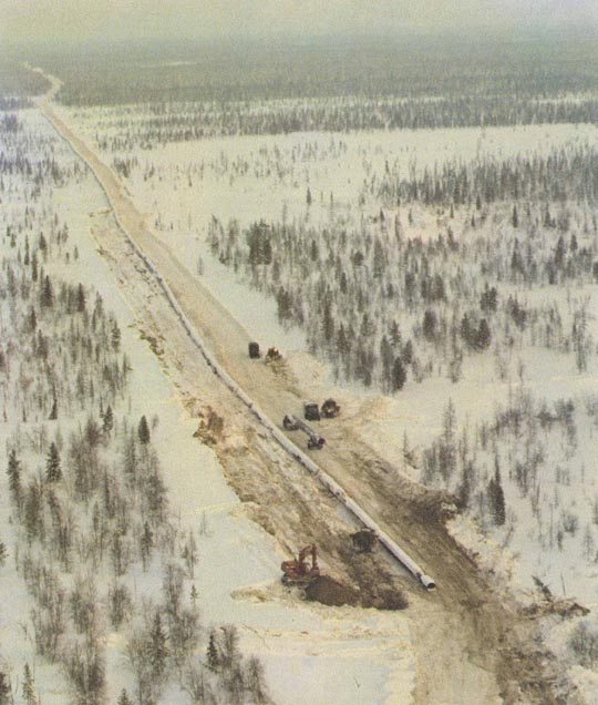 A natural gas pipeline is laid in the Taiga. (circa 1980s)