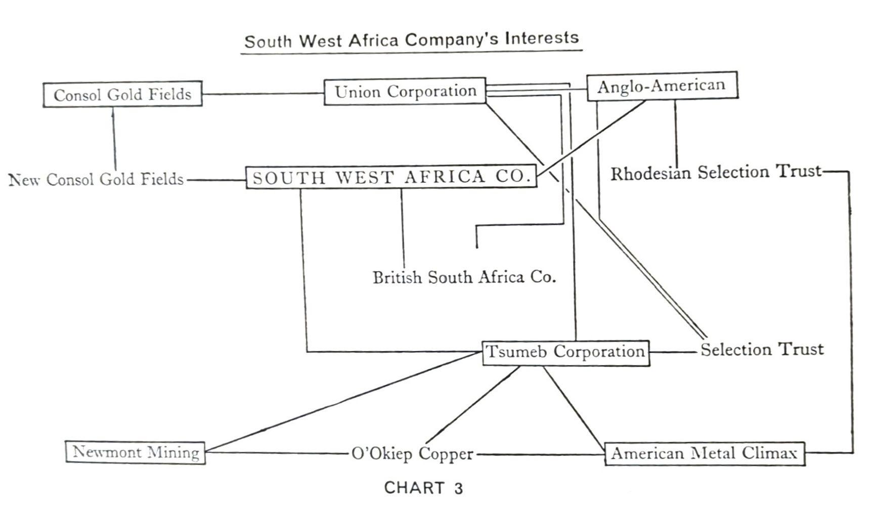 Large areas of land such as those held by the South-West Africa Co. demand extremely heavy capital investment to exploit and encourage the formation of alliances between groups desirous of controlling output, distribution, and hence the prices of raw materials. Not only that, it facilitates the channelling of their processing through the allied organisations. To pursue this policy of co-ordination, the South-West Africa Co. signed an agreement with a joint Anglo American-Consolidated Gold Fields venture by which it sub-leased certain of its rights to explore and exploit its concessions. See Chart 3.
