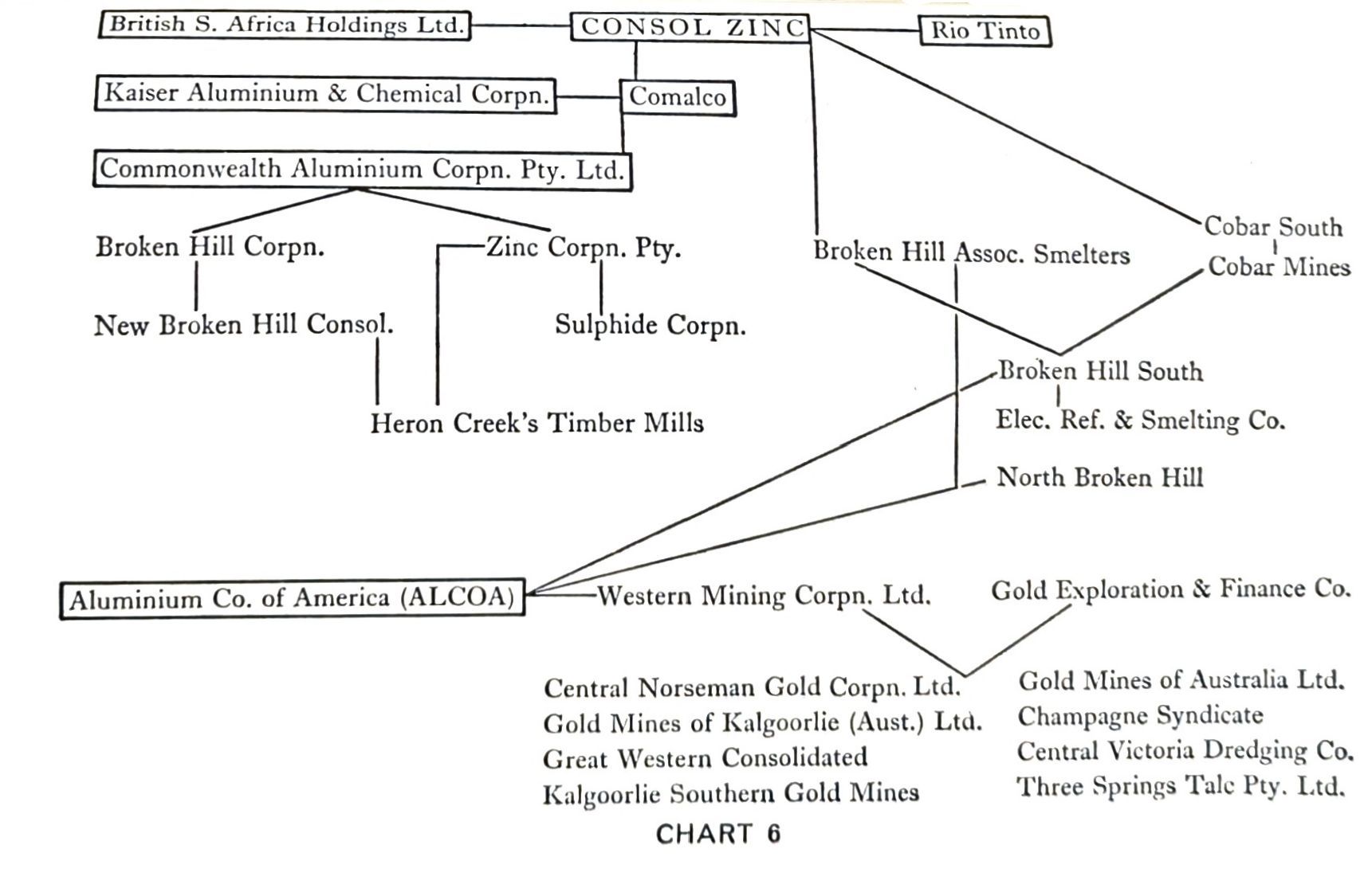 Breaking into the aluminium world, Rio Tinto formed an alliance with Consolidated Zinc Corporation Lt. This merger appeared superficially to bring together two powerful groups having no joint leading strings. This ostensible separation would mislead only the ignorant. Its subterfuge is immediately destroyed by a single glance at its combined directorate, which at once shows up the connections with South African mining and financial interests. P. V. Emrys-Evans is a prominent member, and the Rt. Hon. Lord Baillieu, K.B.E., C.M.G., deputy chairman. Lord Baillieu is also deputy chairman of the Central Mining and Investment Corporation Ltd., a leading investment and finance house within the Anglo American group of companies directed by Harry F. Oppenheimer and C. W. Engelhard. Mr Emrys-Evans is also important in his own right, being vice-president of the British South Africa Co. and a director of Anglo American.